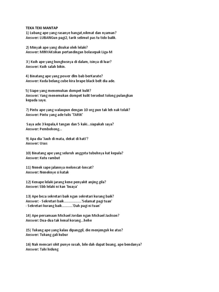 115 Teka-teki lucu dengan jawabannya paling receh mengocok perut. 50 Contoh Teka Teki Logika Serta Jawabannya Sederhana Lucu dan Sulit. Hari ini kami ingin war-warkan bahawa pihak admin telah publishkan satu bahan yang sangat bermakna untuk ibubapa cetak iaitu Senarai Contoh Teka Teki Math Yang Bernilai Untuk Para Murid.